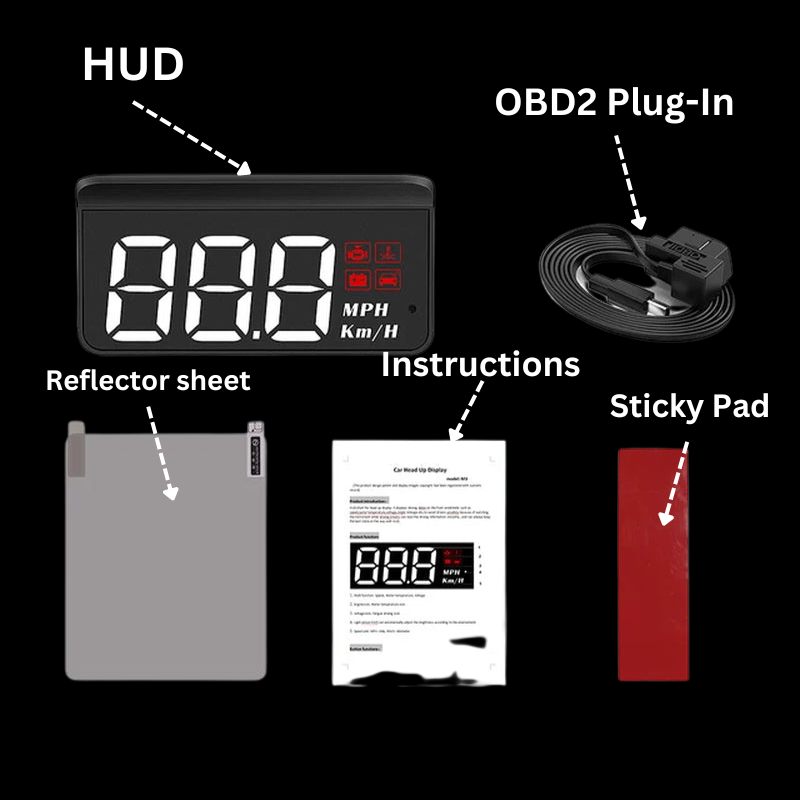 Hud,OBD2 Plug-In, Reflector Sheet, Instructions, Sticky Pad.